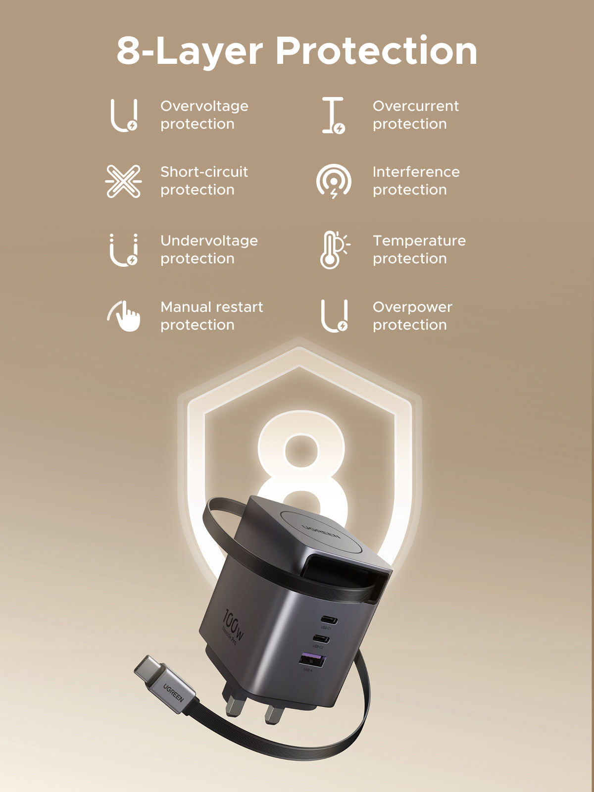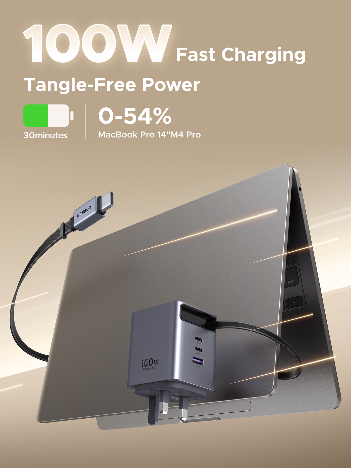 Plug & Play with Retractable Cable: This 100W charger features a built-in 0.75m retractable fast-charging cable—pull to extend and plug in for instant power. No more tangled wires or forgotten cables, making it perfect for travel, work, or home use