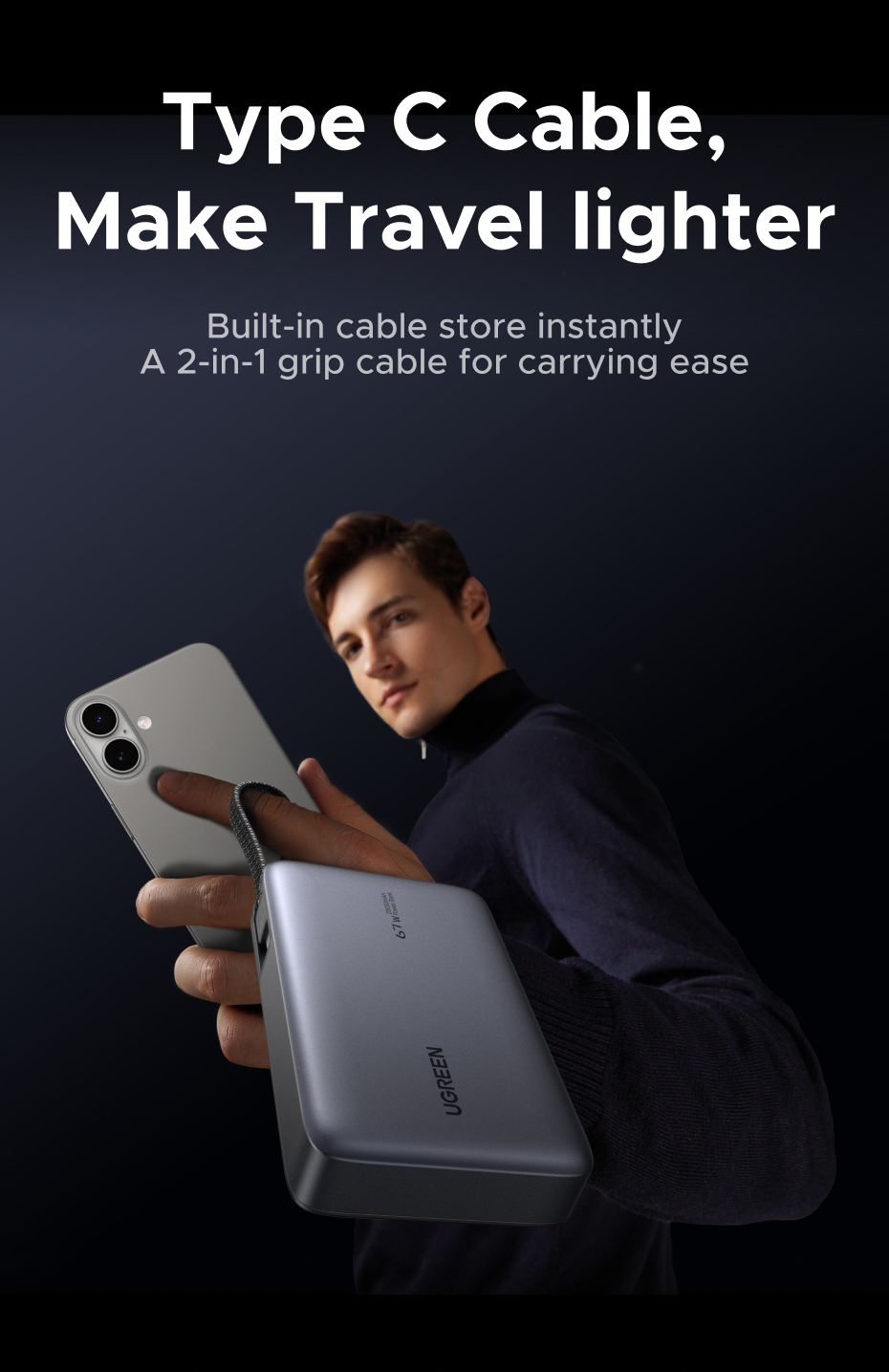 The built-in USB-C cable enables stable, high-speed charging without the need to carry additional cables.