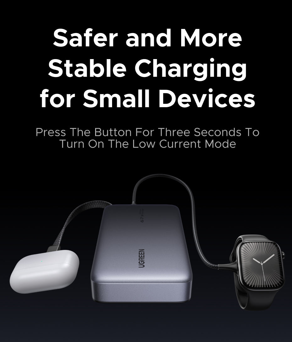 A dedicated low-current charging mode is available for smaller devices such as earbuds and wearables.