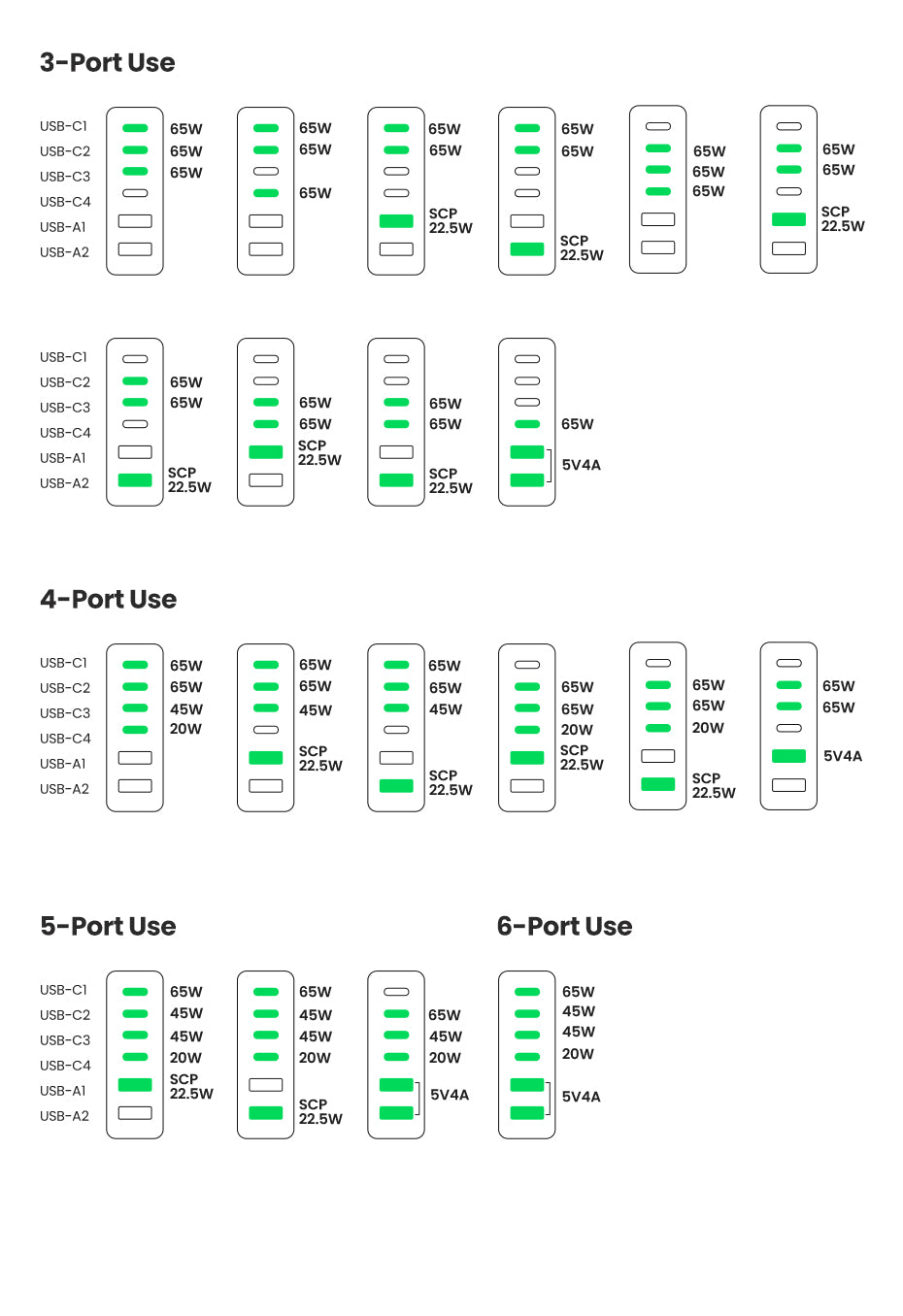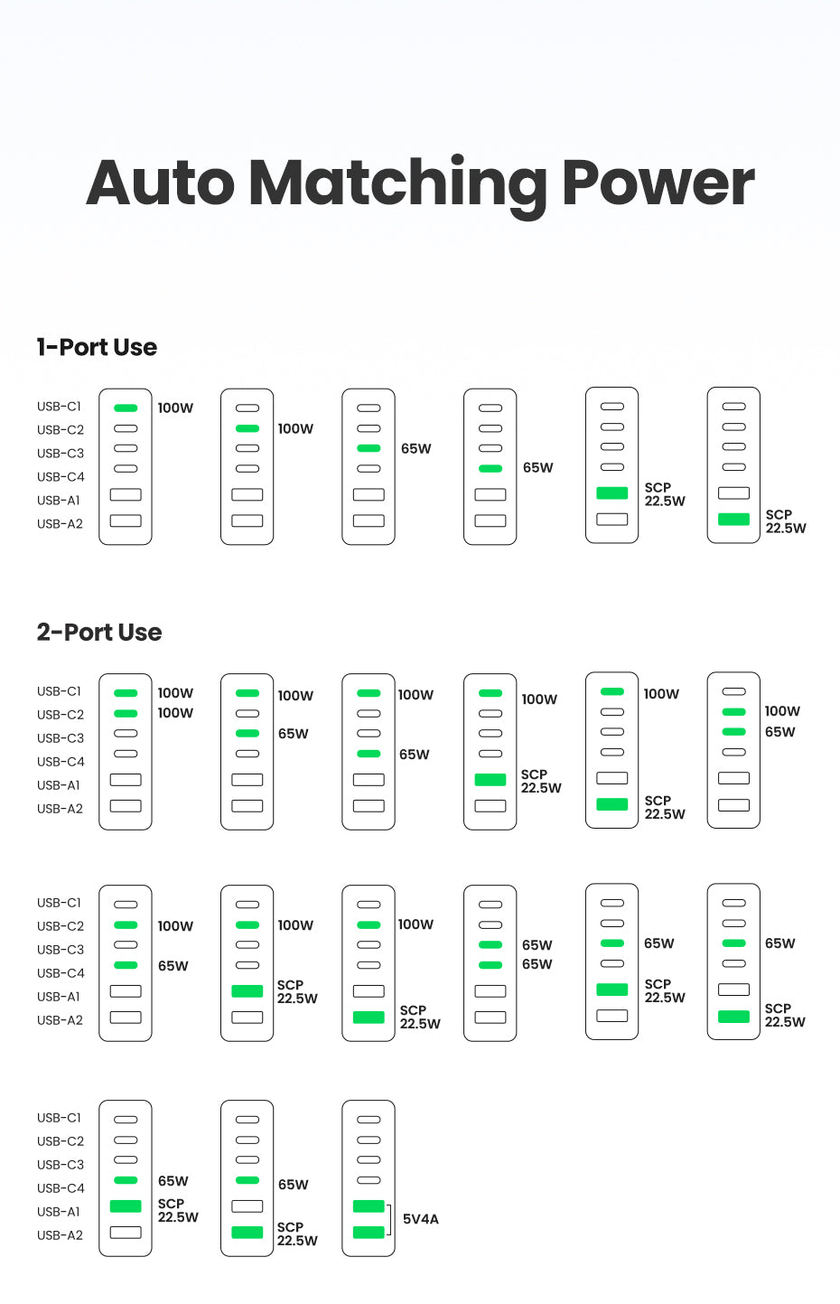 USB-A1/A2: 4.5V/5A, 5V/4.5A, 5V/3A, 9V/2A, 12V/1.5A, 22.5W Max