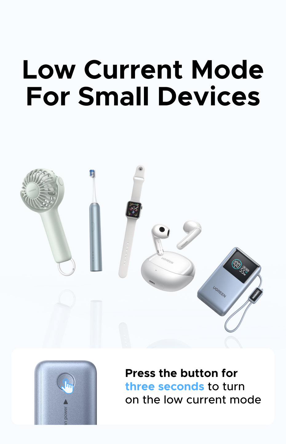 A dedicated low-current charging mode ensures safe charging for small devices such as earbuds and wearables.