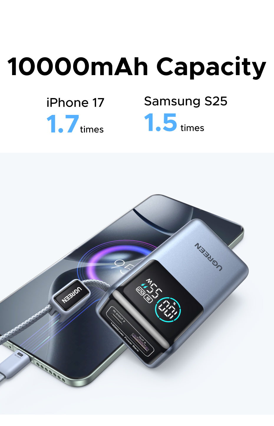Featuring a 10000mAh high-rate battery, this power bank retains up to 80% capacity after 800 charge cycles, delivering approximately 4× longer cycle life compared to conventional power banks. Ideal for daily use, travel, and work on the go.